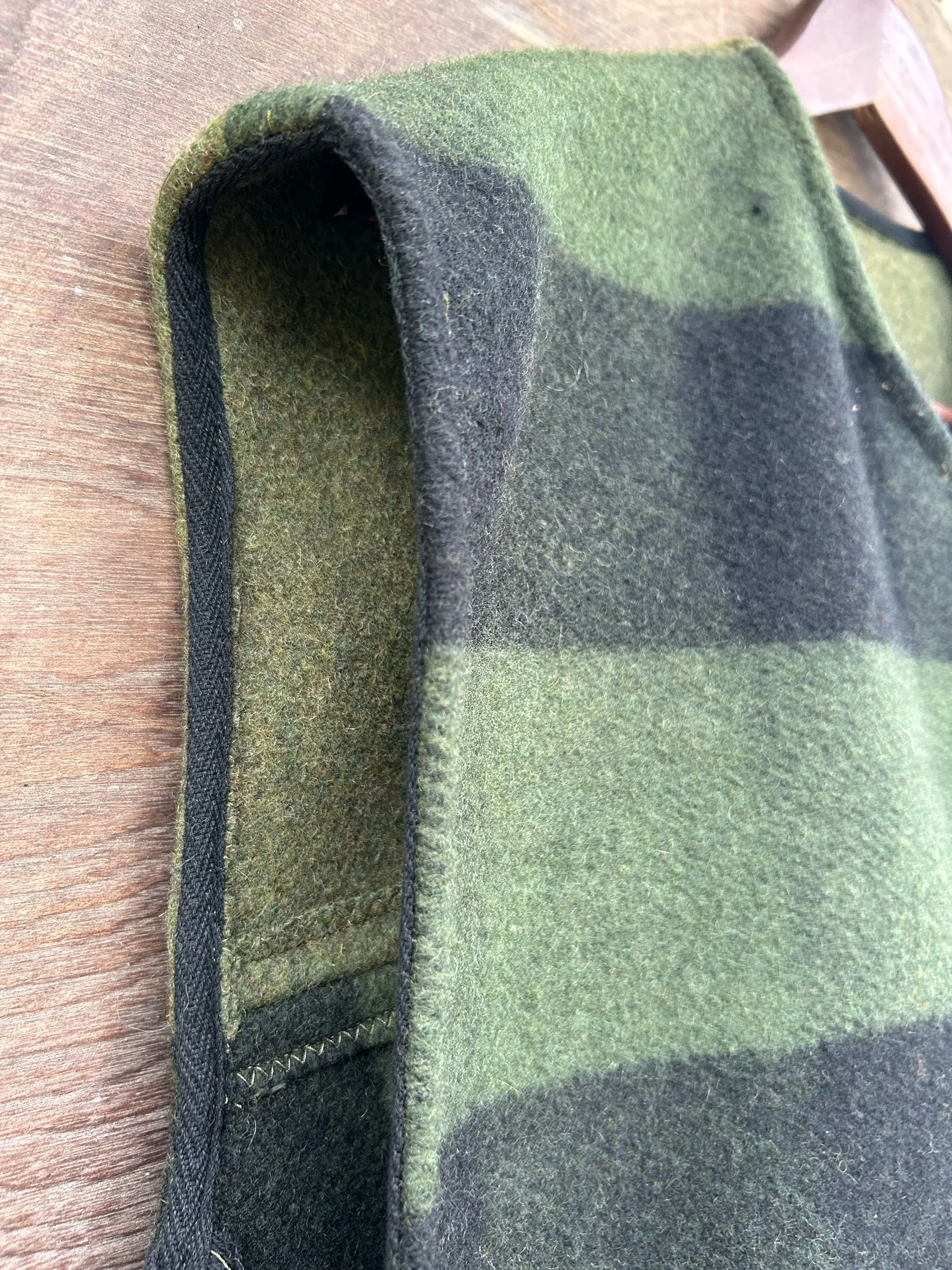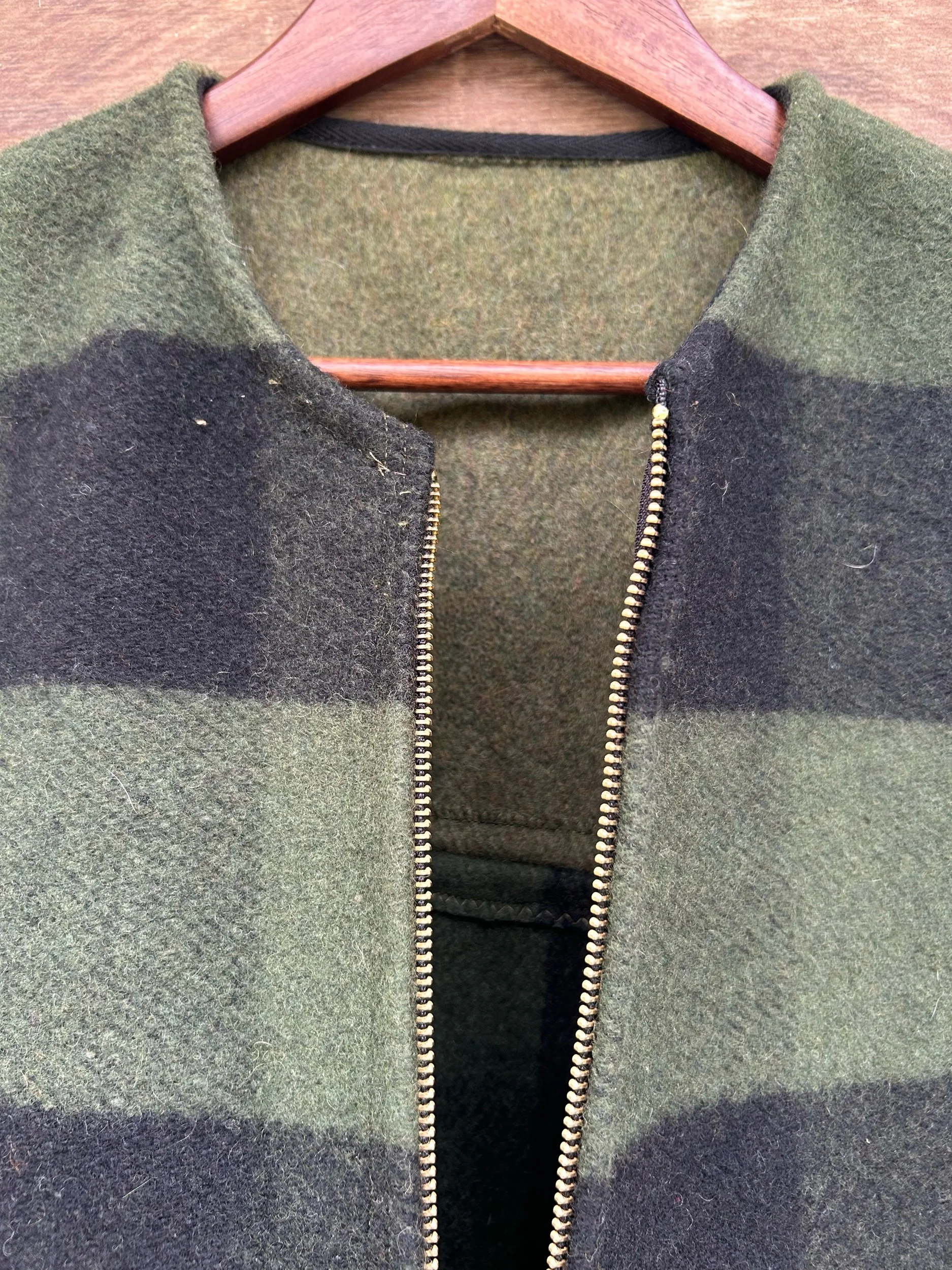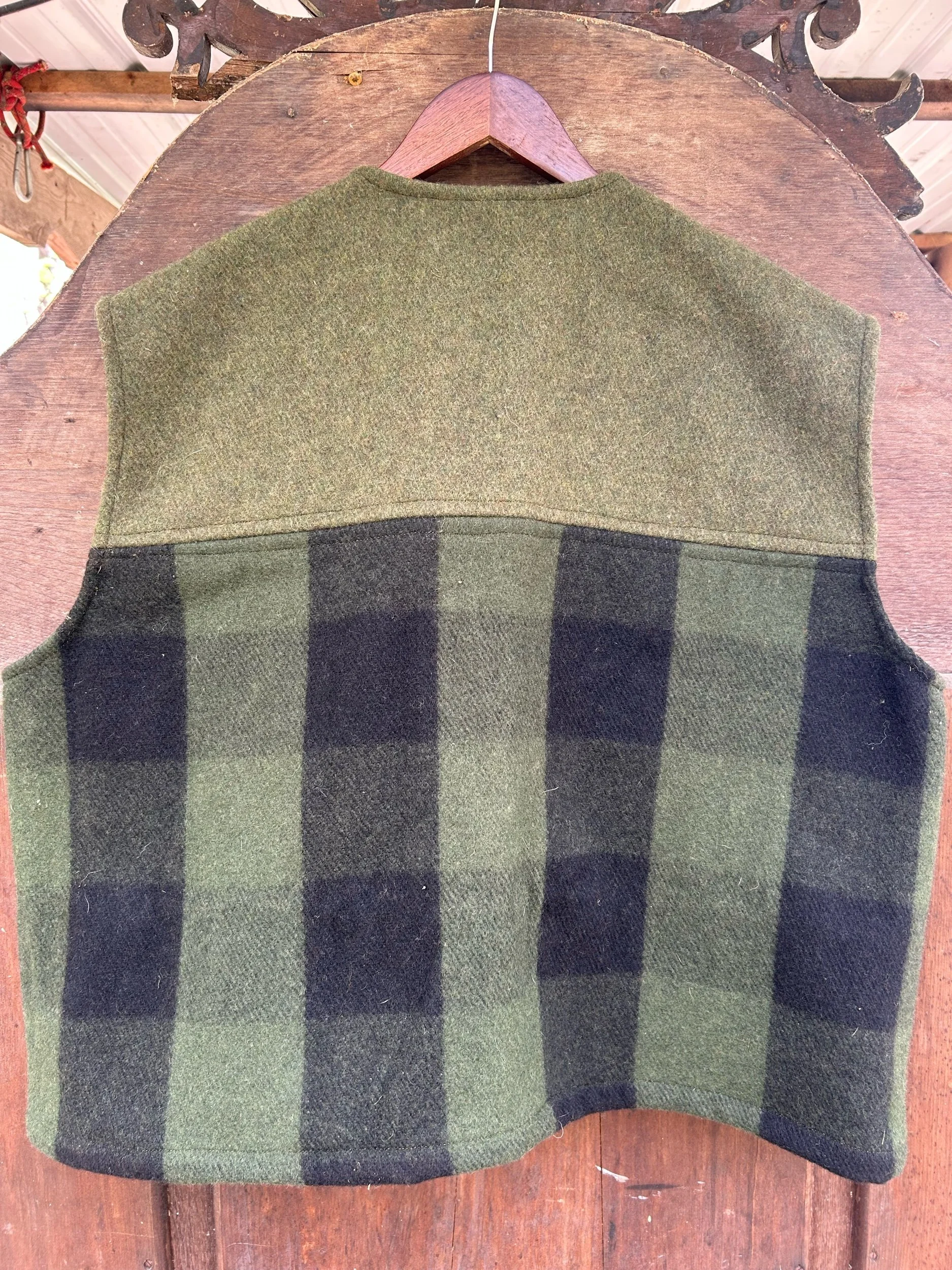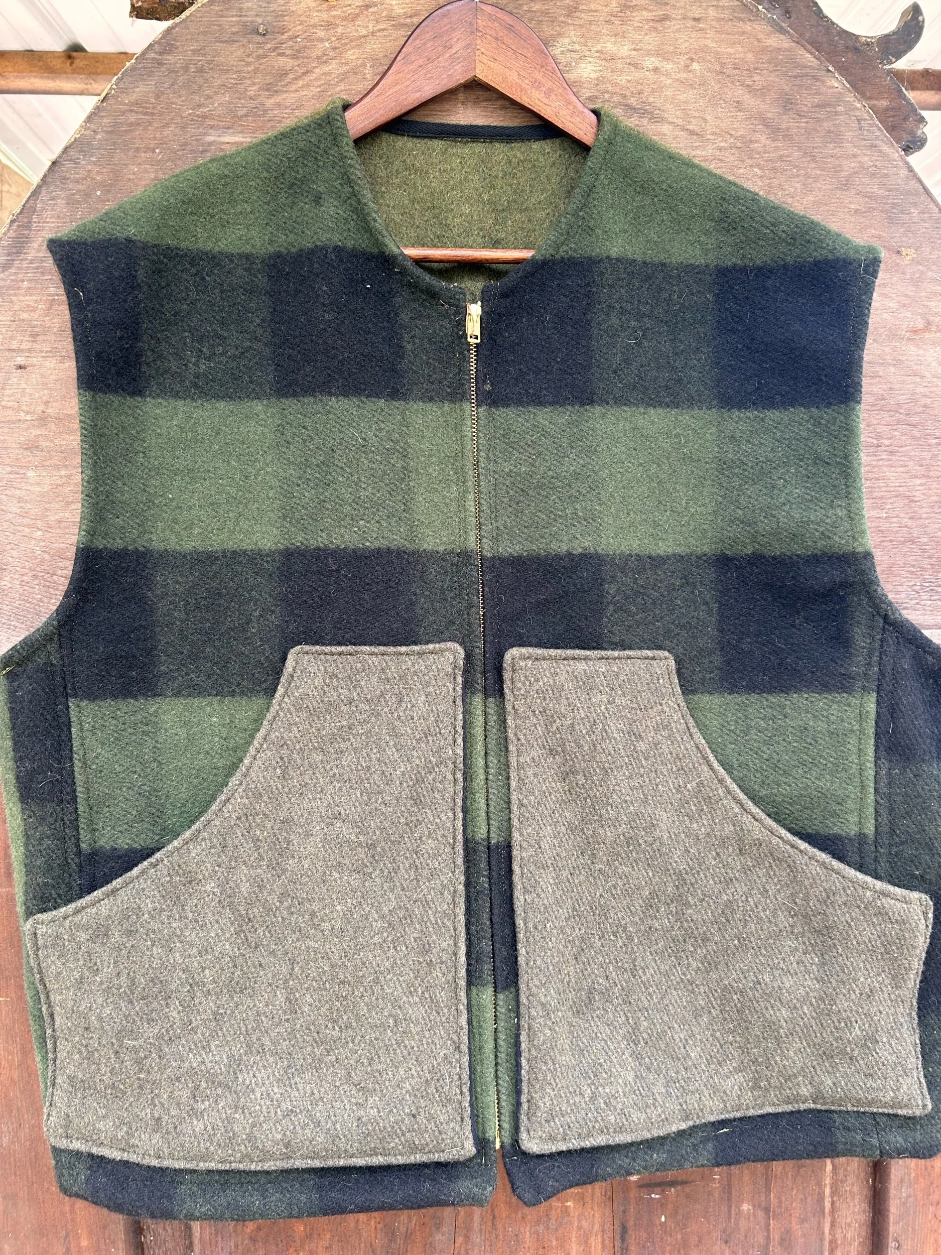 80% wool vest in green plaid with olive green accents. Front pockets are lined with 100% cotton flannel. Zipper is metal. Machine washable cold and line dry only. This vest is xtra large but for a slightly shorter torso. The zipper I used is an inch shorter that the regular length.