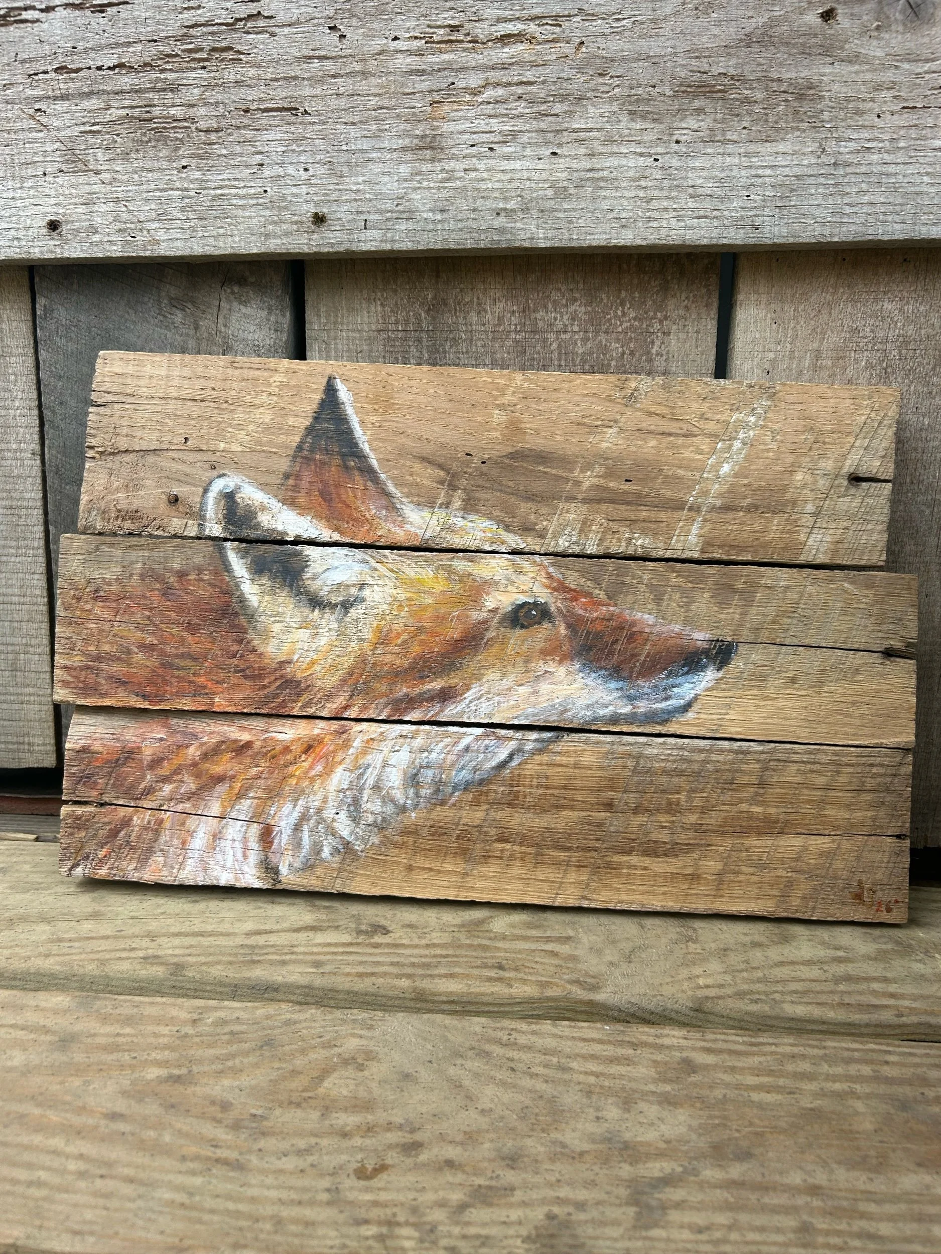 Image 1 of 2 Image 2 of 2 Red Fox $80.00 Painting of Red Fox in acrylic on reclaimed oak barn wood measuring 11” x 18”. Wire mounted on the back for hanging. Get notified by email when this product is in stock. Add To Cart Added! Painting of Red Fox in acrylic on reclaimed oak barn wood measuring 11” x 18”. Wire mounted on the back for hanging.